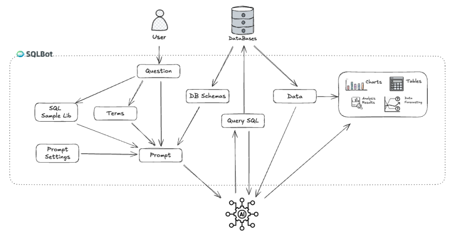 用户首先以自然语言的方式输入问题,SQLBot接收这个问题后,进入语义理解与上下文构建阶段。SQLBot会综合利用Terms(术语库),SQL SampleLib(示例 SQL 库)和Prompt Settings(提示词配置)共同形成 Prompt(提示上下文)来作为 AI 模型理解用户问题的基础输入。与此同时,SQLBot 会自动读取数据库元信息(Schemas),包括表名、字段名、数据类型及外键关系,并生成Prompt作为辅助输入。然后AI模型接收构建好的Prompt(含问题、Schema、样例、术语映射等),生成一条符合语义的SQL查询语句。生成的SQL会发送至数据库(DataBases)执行,查询真实数据(Data)。SQLBot 会校验结果结构(列名、数据类型),并将结果封装为可用的数据对象。