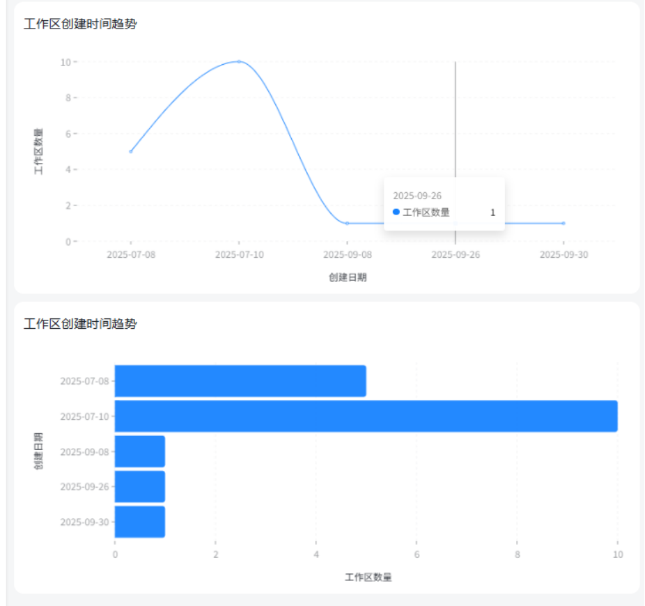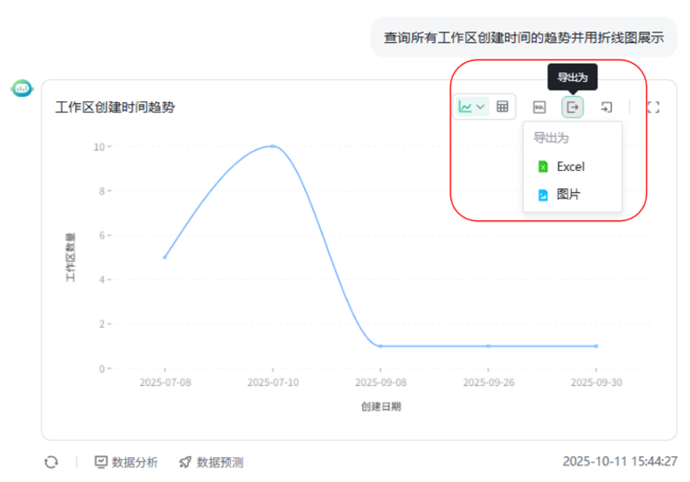 功能说明:SQLBot 支持在执行SQL语句查询后,将结果数据以折线图、柱状图、条形图等形式进行可视化展示并将绘制结果保存为图片以及能将元数据导出为Excel表格保存。用户可以通过自然语言描述(如“帮我画出过去六个月各租户的数据增长趋势”),由系统自动识别数值字段与时间字段,生成对应图表。