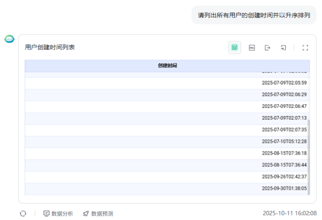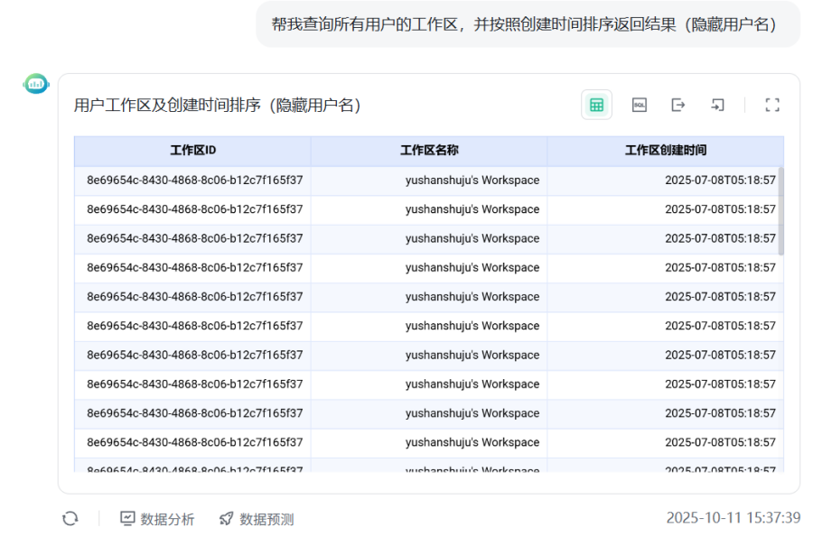 羽山数据在本地部署的 SQLBot 平台中,集成并扩展了 DIFY 平台下的 10 张核心业务数据表,涵盖账户、租户、应用、工作区等模块。团队通过自然语言问数的方式,对单表查询、多表关联、数据绘图及数据格式规范核心功能进行了系统性测试与性能验证。