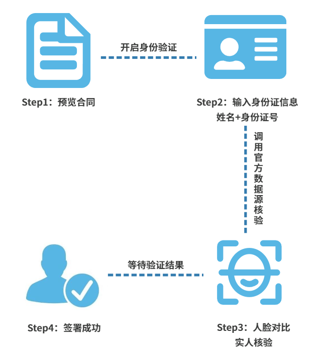 人脸活体识别比对,公安人口库校验;拥有完整证据链;信息加密,点对点签署