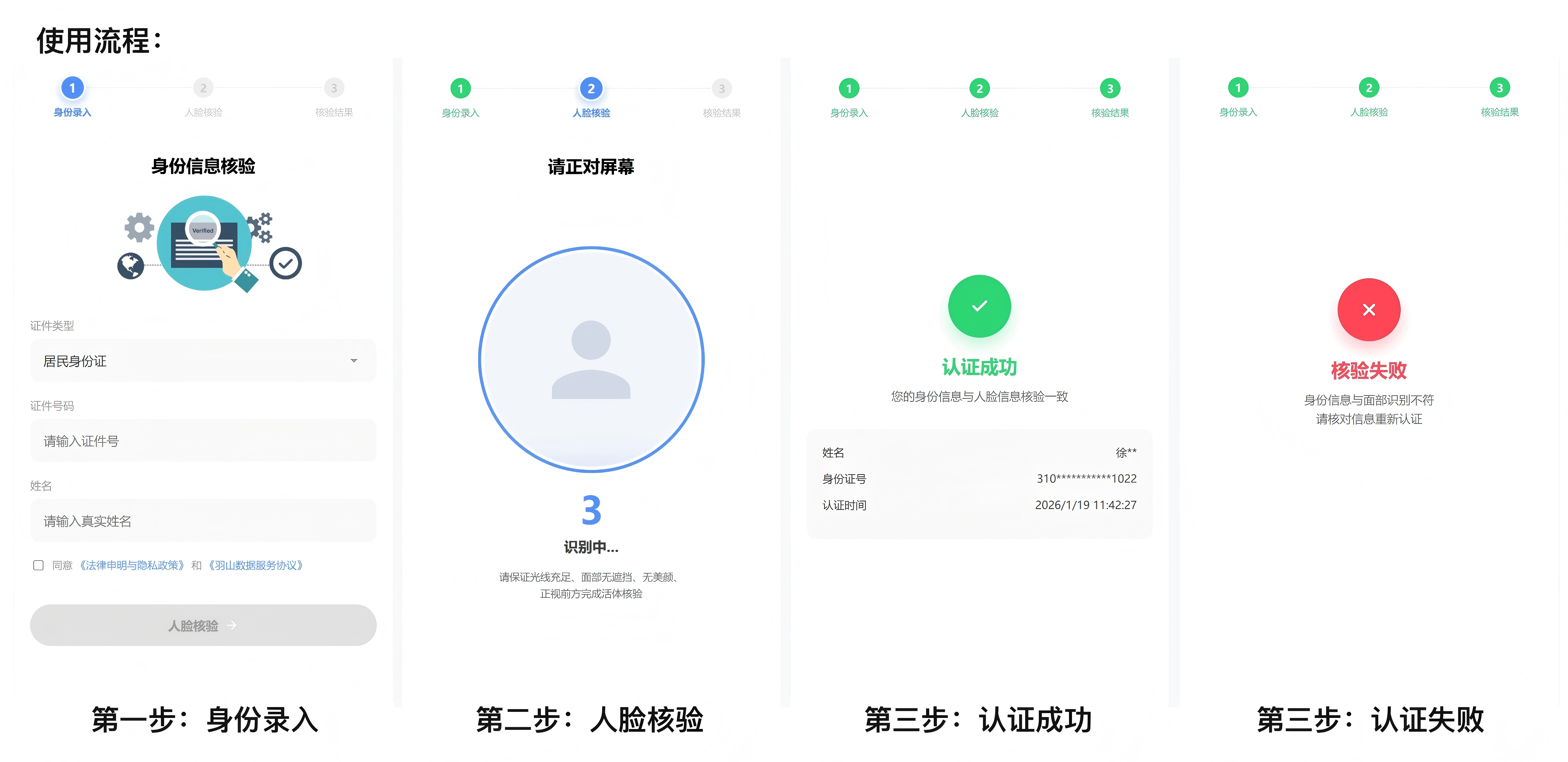 严格遵循国家个人信息保护法规,内置标准化的隐私协议签署流程与规范的权限管理机制,确保业务合规。在用户体验上,系统引入了人性化的AI智能引导逻辑,针对光线、遮挡或操作不当等识别失败场景提供清晰的实时反馈与纠错提示,有效解决了传统认证流程繁琐、通过率低的问题,大幅提升了用户满意度与转化率。